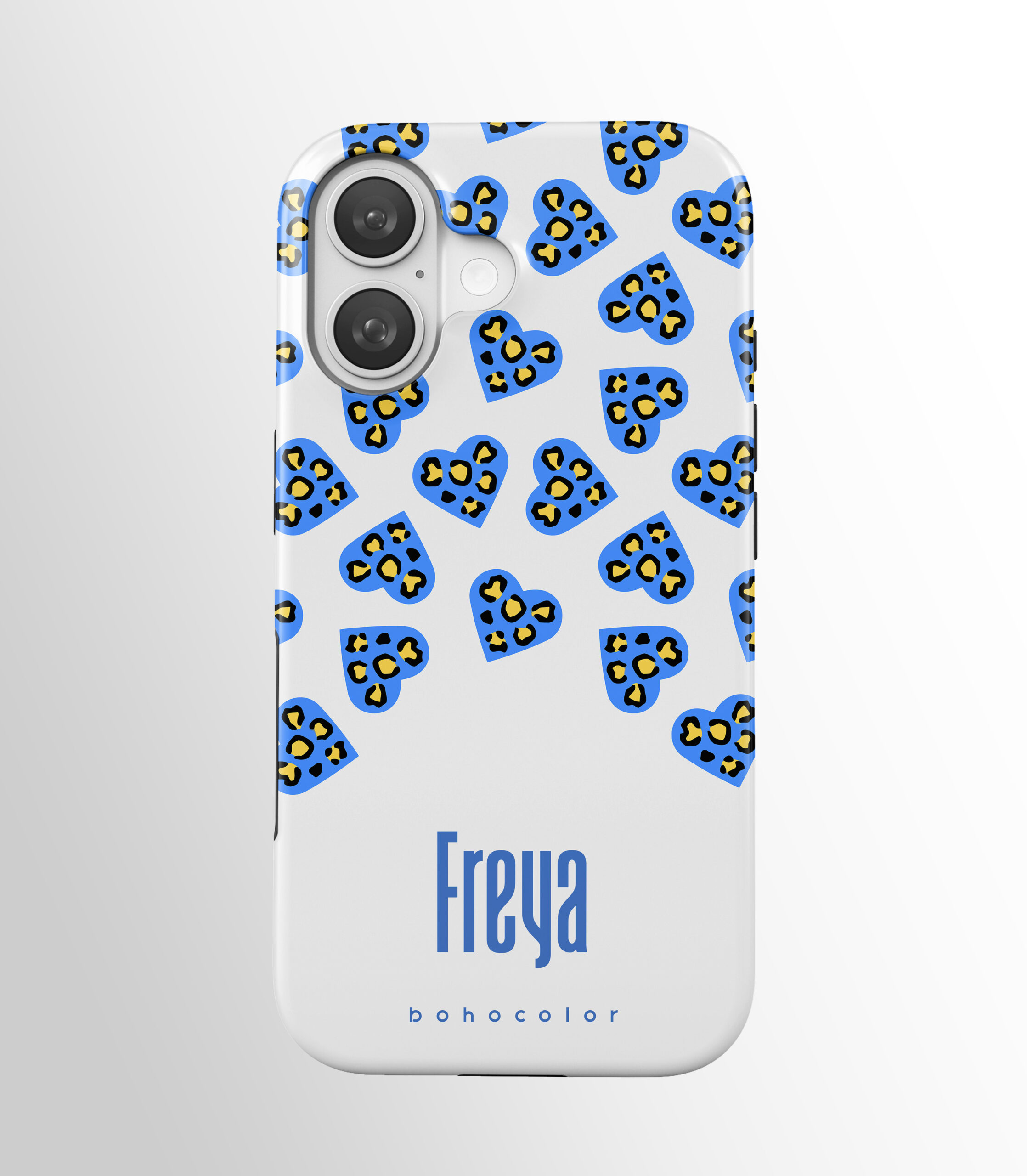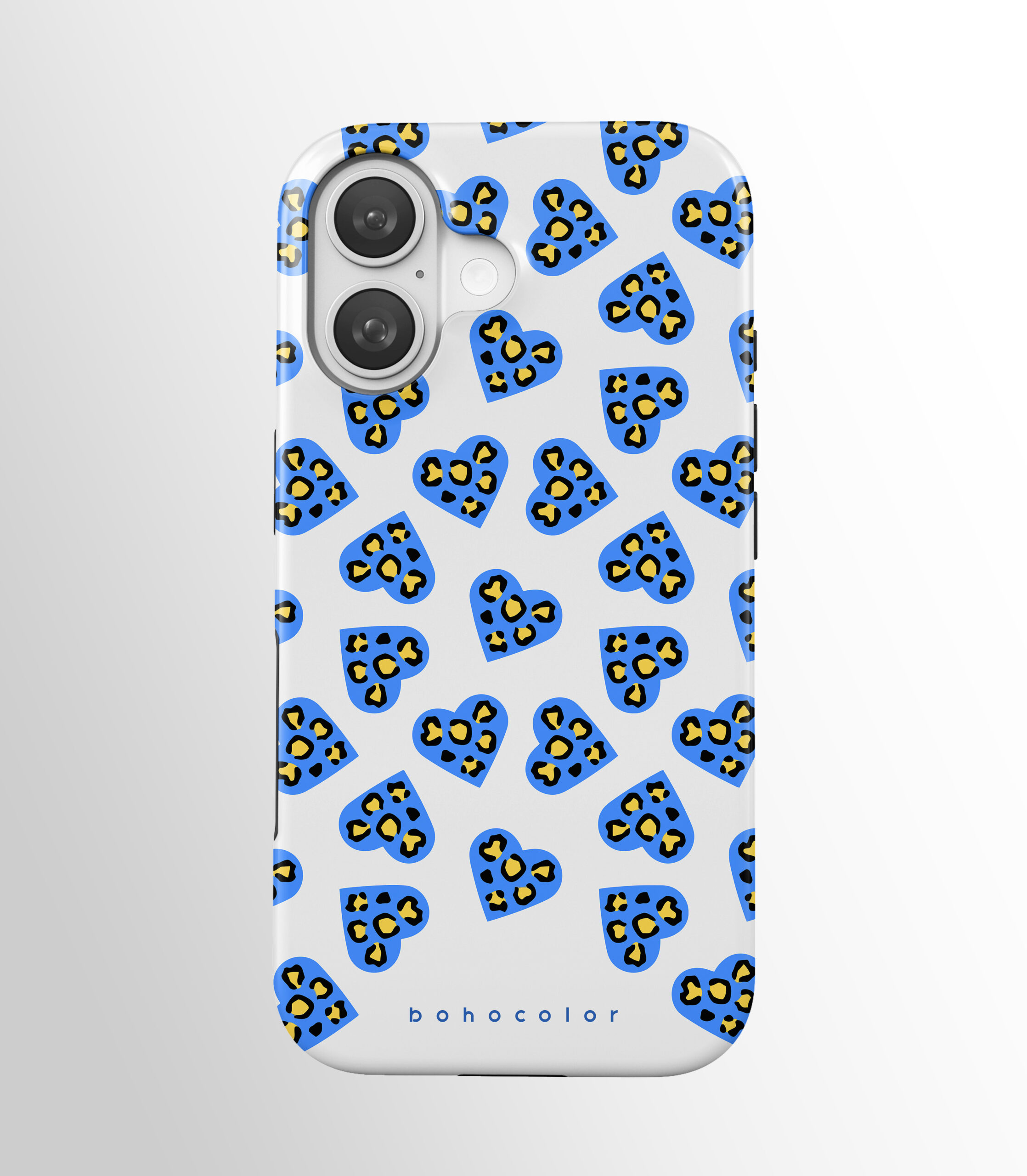 Fall in love with wild style using this unique personalized phone case. Blue hearts adorned with playful leopard spots create a quirky, charming design. This custom case is a fun, flirty accessory for a bold statement.
